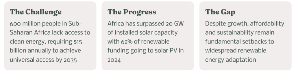 - Highlights decentralised solar systems as practical solutions to grid constraints and rural electrification gaps.