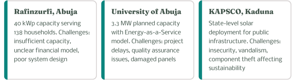 Solar energy is often seen as a promising solution to Nigeria’s energy crisis; however, the large-scale deployment of off-grid solar energy solutions has faced significant hurdles such as policy coordination gaps, funding constraints, and technical challenges, which have limited its effectiveness in driving rural economic development. According to the Rural Electrification Agency’s Nigeria Electrification Programme (NEP), addressing these challenges requires structured stakeholder engagement and systematic data gathering from existing mini-grid and off-grid projects implemented across the country (NEP – Rural Electrification Agency, n.d.; African Development Bank Group, 2025). Examining data from solar mini-grids in Abuja and Kaduna uncovers common issues in off-grid solar energy deployment for rural communities. Many projects have insufficient capacity due to high costs and inadequate technical designs, failing to meet local energy needs. Costs, on the other hand, are a major concern, as most homes and companies cannot financially support the expensive outlay, let alone the ongoing costs, despite the availability of subsidies (World Bank, 2023; African Development Bank Group, 2025).
